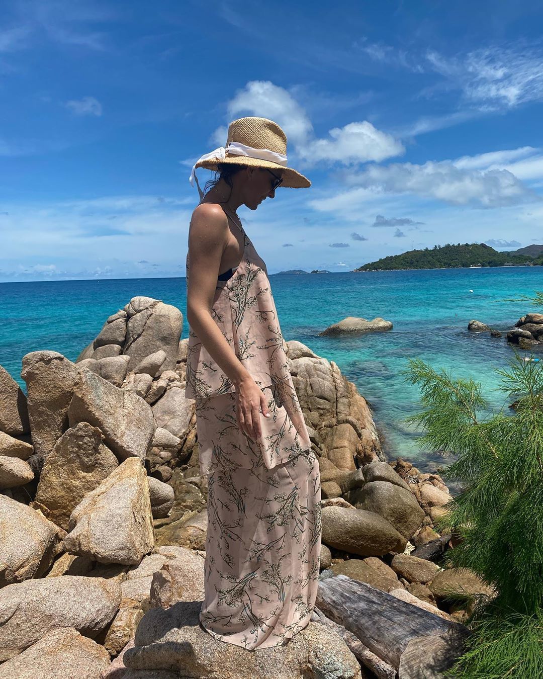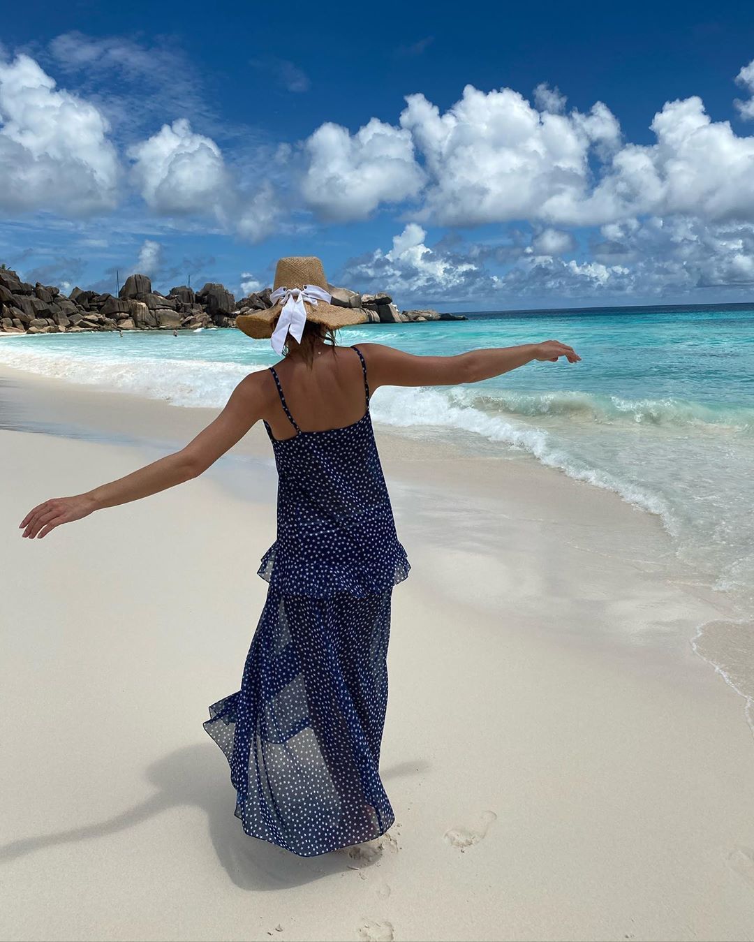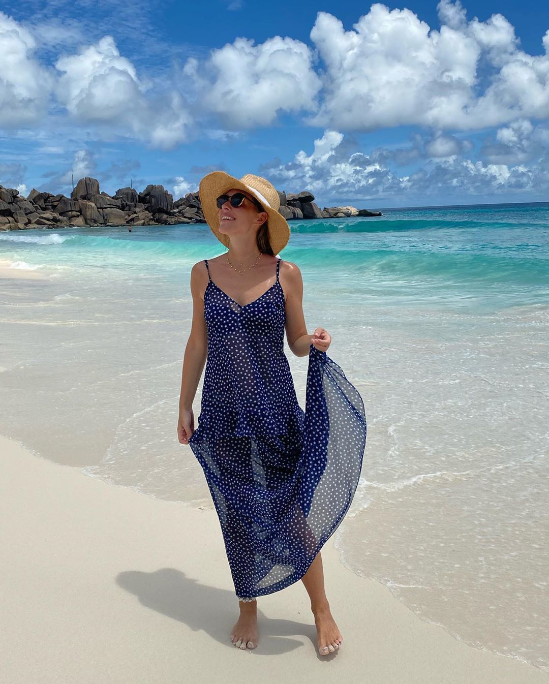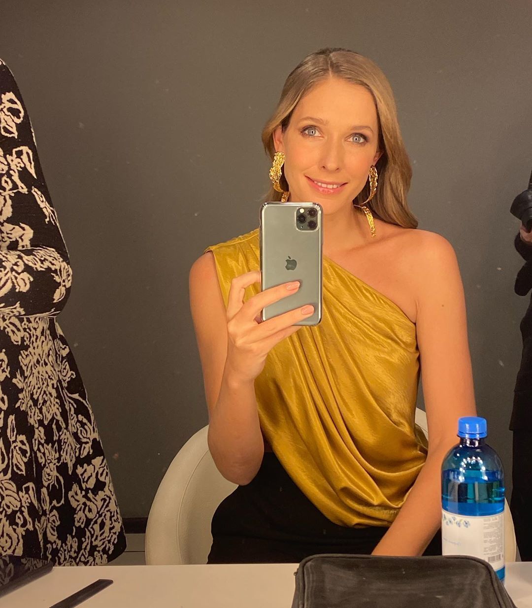 Наряд Осадчая дополнила бежевыми босоножками с блестками, длинными серьгами и украшением на волосы. Аккуратная укладка и нежный макияж завершил ее аутфит.