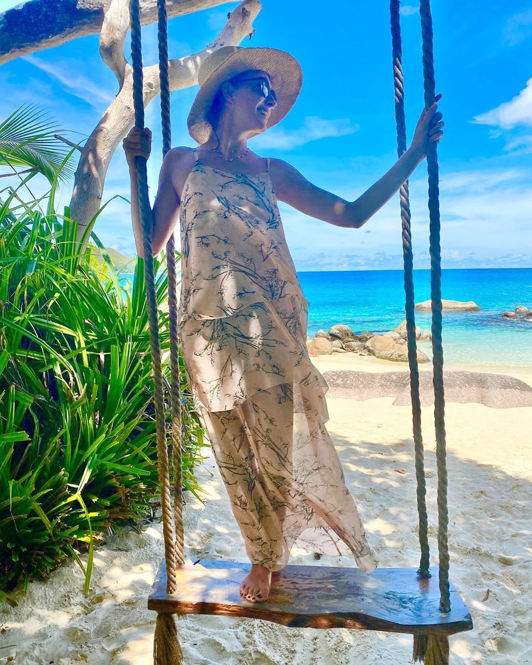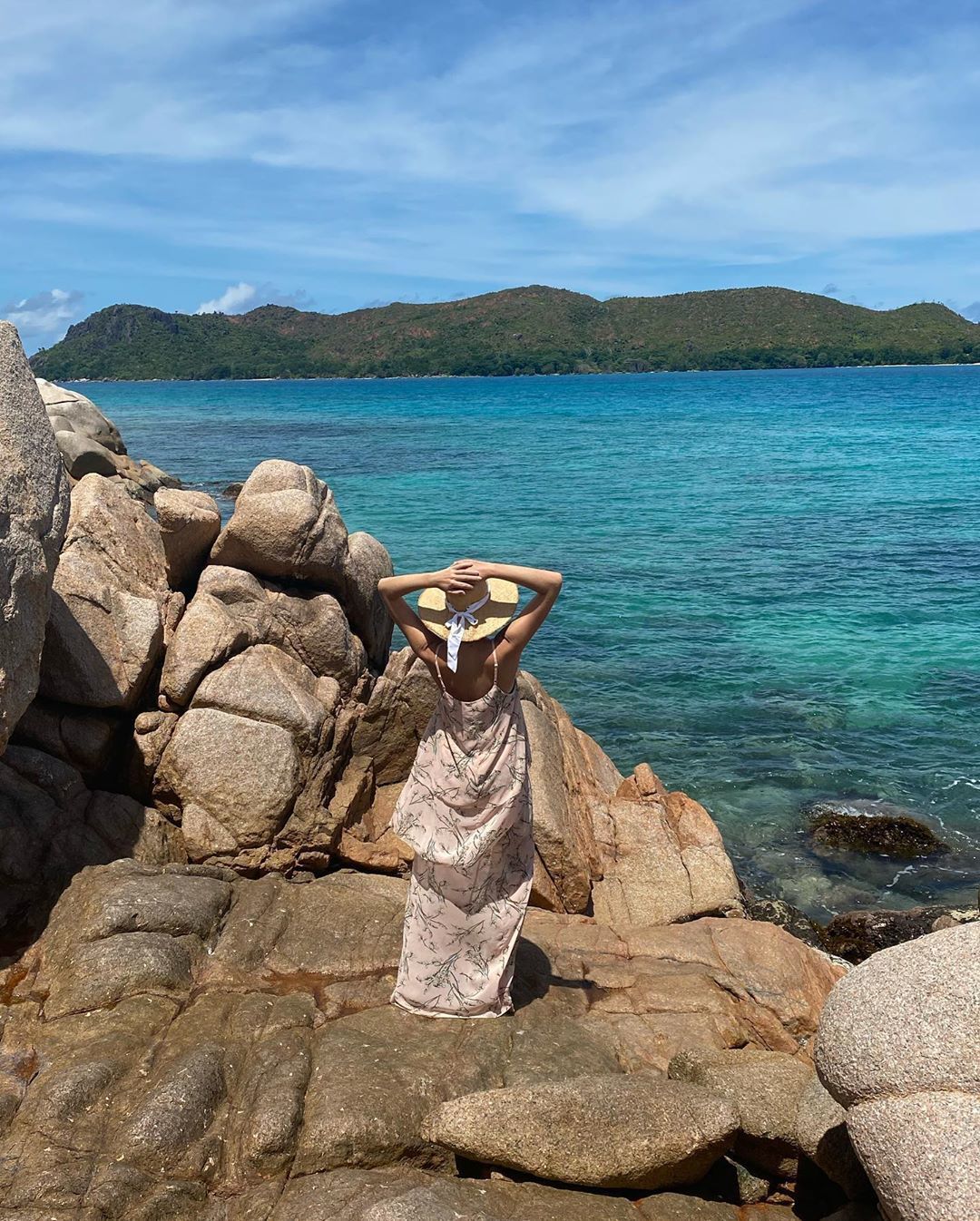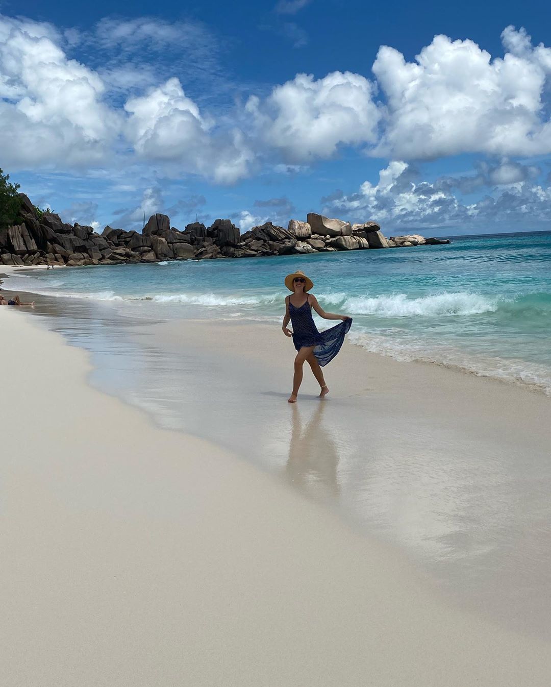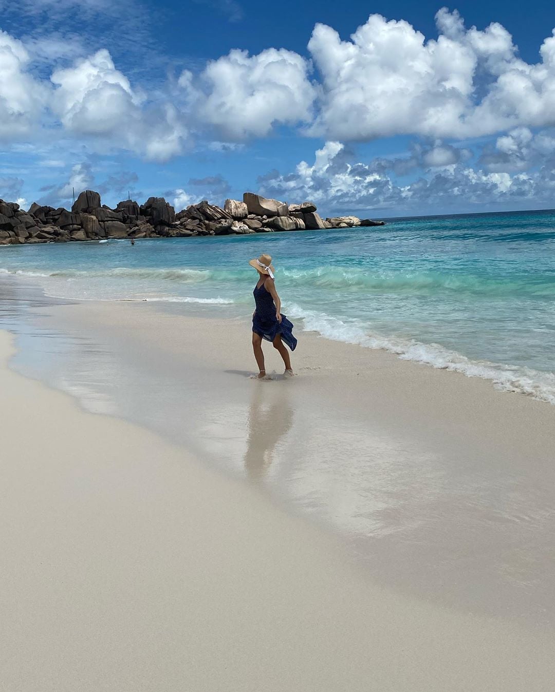 Наряд Осадчая дополнила бежевыми босоножками с блестками, длинными серьгами и украшением на волосы. Аккуратная укладка и нежный макияж завершил ее аутфит.