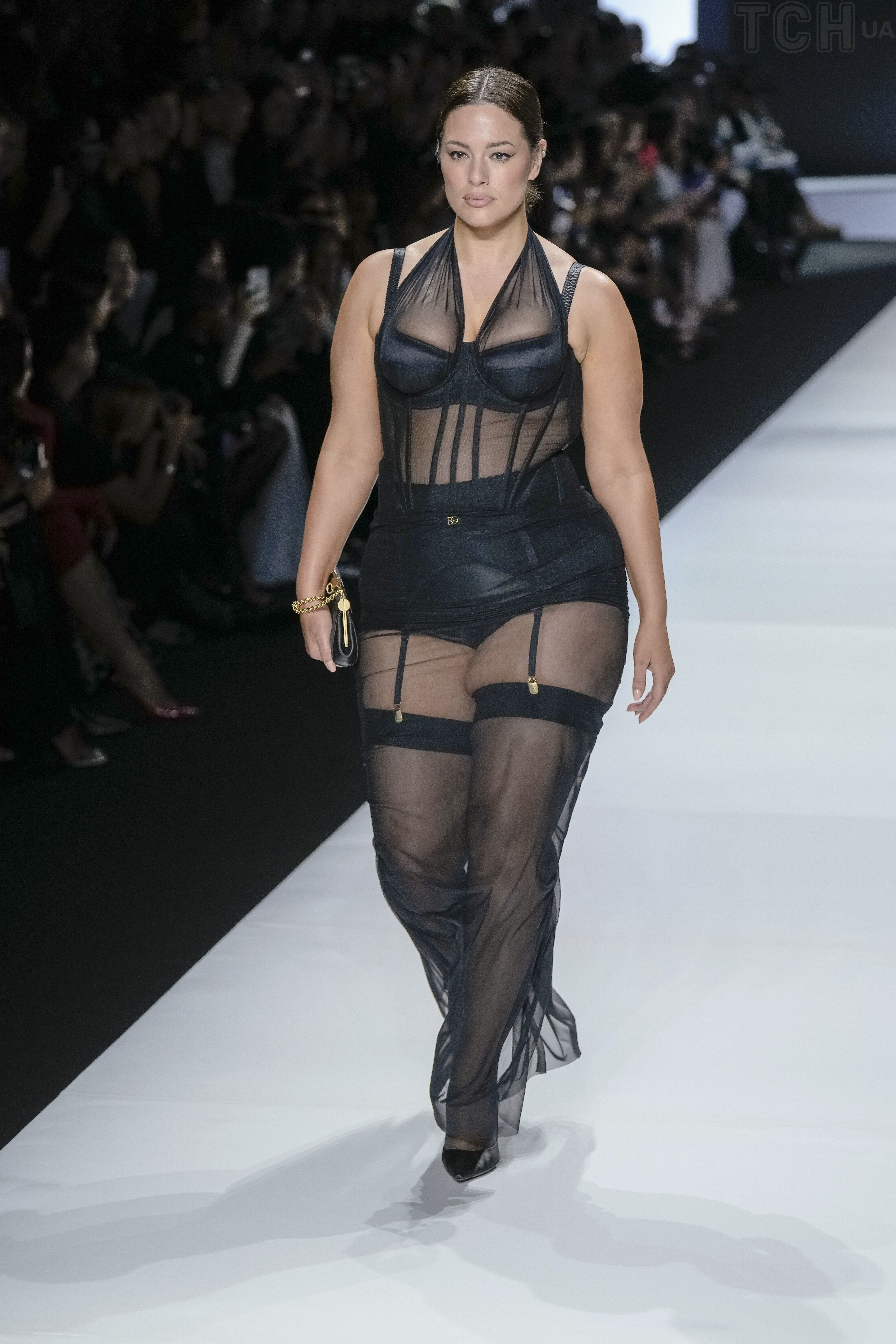 Эшли продефилировала по подиуму в черном ансамбле, состоящем из вязанного бюста, под которым был белый топ и прозрачной юбки макси. Обута Грэм была в черные босоножки на каблуках. Каштановые волосы модели были распущены и развивались легкими волнами, а на ее лице был макияж в теплых оттенках.