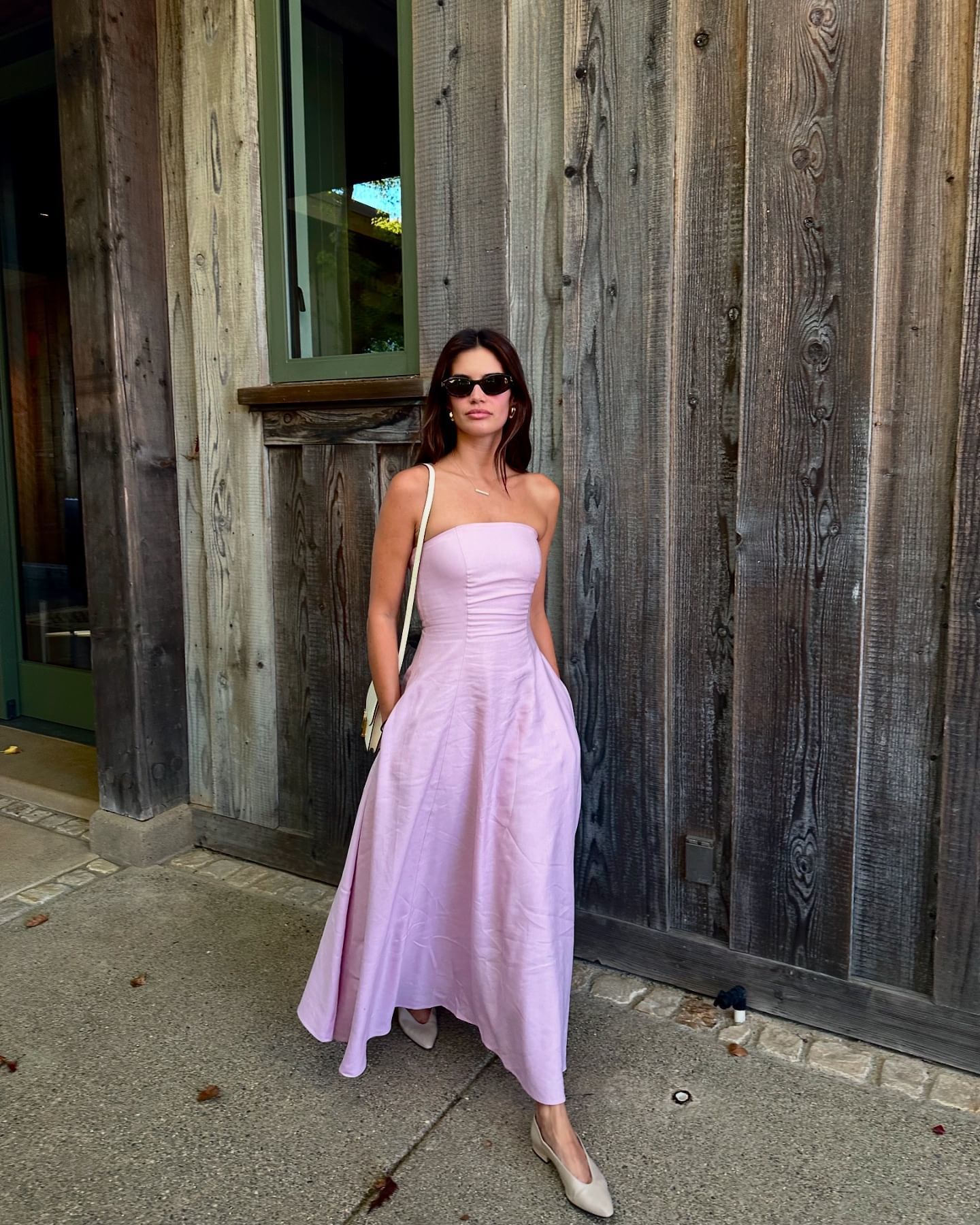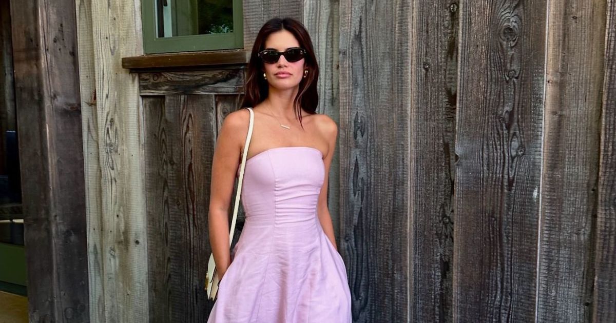 На фото девушка позировала в розовом платье-бюстье, которое дополнила белой сумкой Hermes, молочными туфлями на низком каблуке и изящными золотыми аксессуарами.