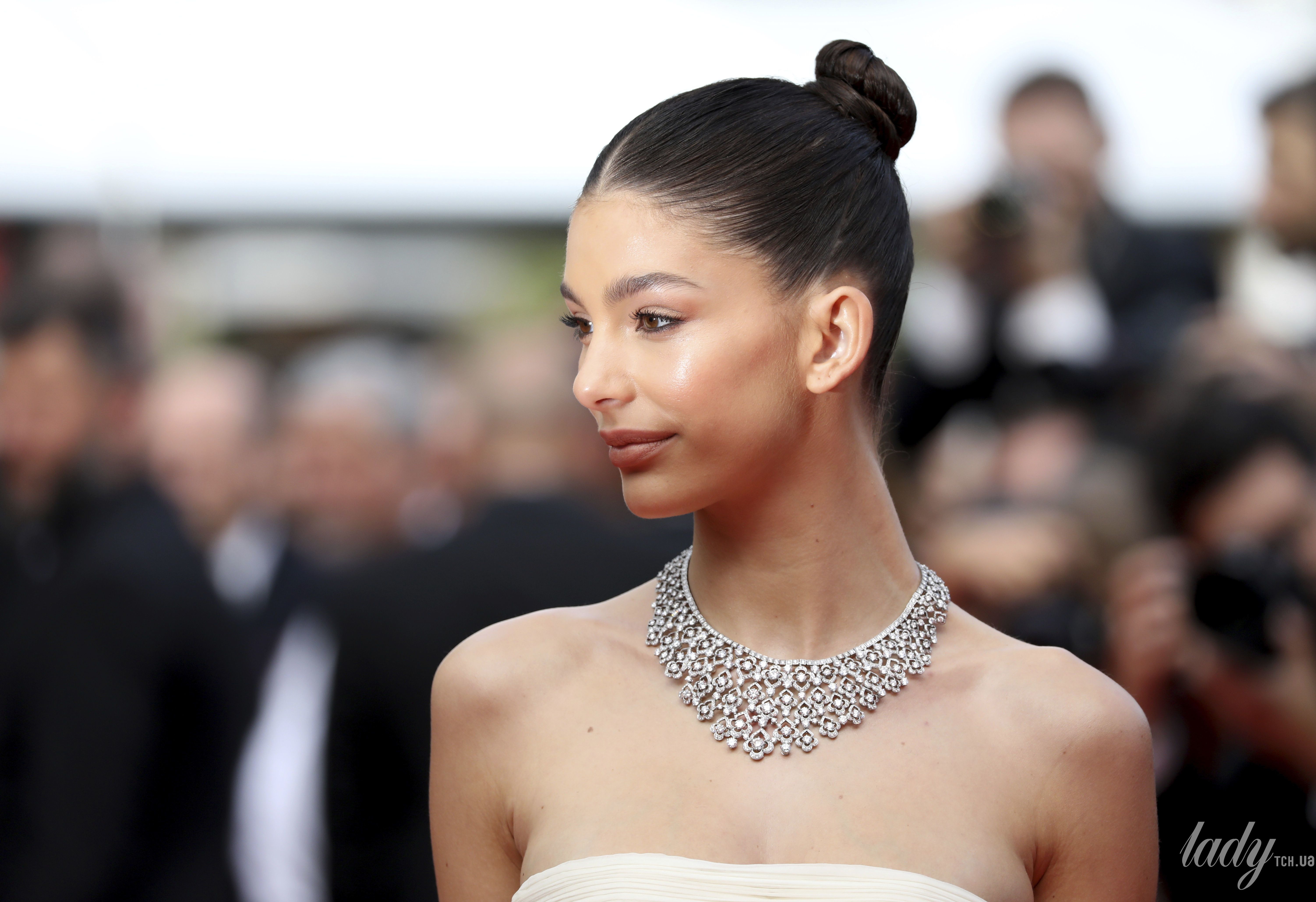 На красную дорожку модель надела роскошное платье-бюстье с длинным шлейфом, украшенным перьями. Нежный образ Камилы завершили нюдовый макияж и массивное колье с бриллиантами. Волосы Морроне собрала в высокий пучок.
