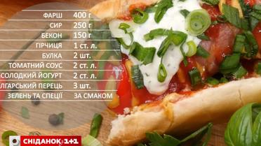 Для приготовления такого хот-дога нам понадобятся 400 г фарша, 250 г сыра, 150 г бекона, горчица, 2 булочки, томатный соус, несладкий йогурт, болгарский перец, зелень и специи.