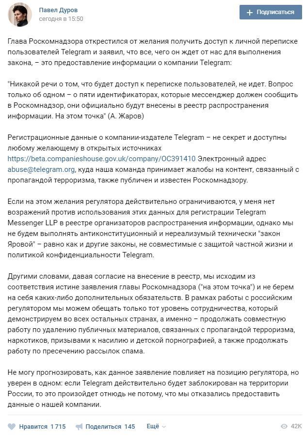 "Глава Роскомнадзора открестился от желания получить доступ к личной переписке пользователей Telegram и заявил, что все, чего он ждет от нас выполнения закона, - это предоставление информации о компании Telegram... Если на этом желание регулятора действительно ограничиваются, у меня нет возражений против использования этих данных для регистрации Telegram Messenger LLP в реестре организаторов распространения информации, однако мы не будем выполнять антиконституционный и технически невыполнимый "закон Яровой" - так же как и другие законы, не совместимы с защитой частной жизни и политикой конфиденциальности Telegram", - заявил Дуров на своей странице во "ВКонтакте".