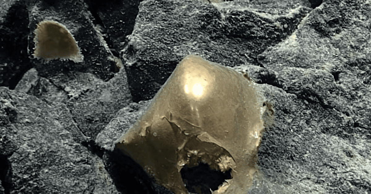 Необычный золотистый объект нашли на глубине около 3250 метров — он был прикреплен к скале и имел отверстие посередине. После находки ученые выдвигали различные версии: от яйцевой оболочки или мертвой губки до других предположений. Открытие вызвало значительный общественный интерес и оживленное обсуждение.