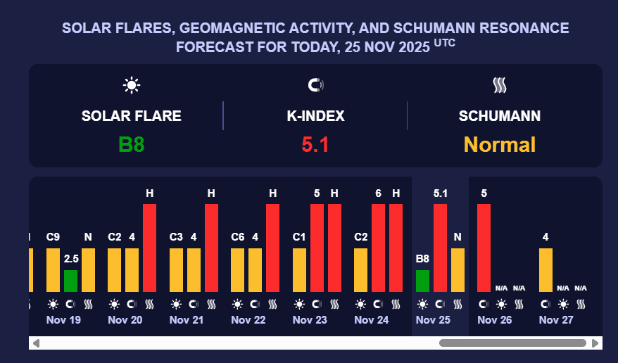 В среду 26 ноября магнитная буря держится на высоком уровне. Солнечная активность соответствует К-индексу 5 (красный уровень).