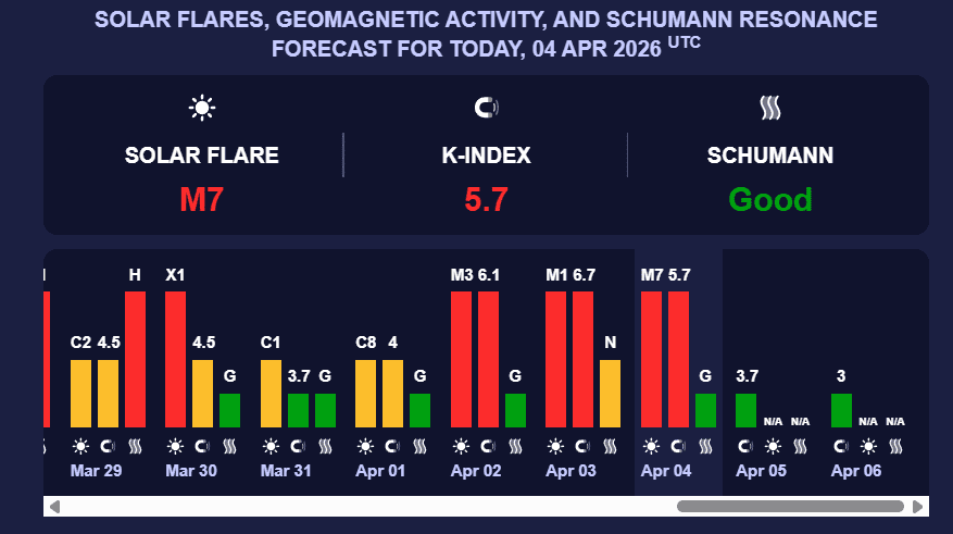 В воскресенье, 5 апреля, мощность магнитной бури ослабит. Активность Солнца будет с К-индексом 3,7 (зеленый уровень).