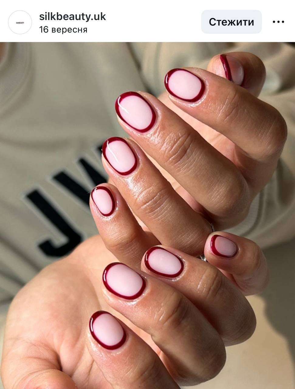 Если хочется классики, но не в очень классическом исполнении, – замените традиционный французский маникюр на что-то более сезонное. Клюквенный цвет особенно хорошо сочетается со светло-розовым – идеально для яркой нейтральной основы.