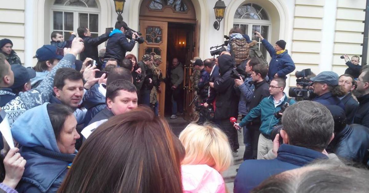 Так, около 10 человек перелезли через забор и открыли ворота. За ними еще около 50 человек в униформе с нашивками "Правого сектора" и без шевронов ворвались в здание, сообщает корреспондент ТСН.