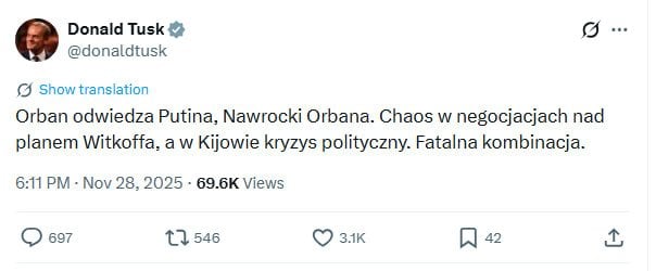 «Орбан посещает Путина, Навроцкий — Орбана. Хаос в переговорах по плану Уиткоффа (спецпредставителя президента США Стива Уиткоффа — ред.) и политический кризис в Киеве. Фатальное сочетание», — написал премьер Польши.