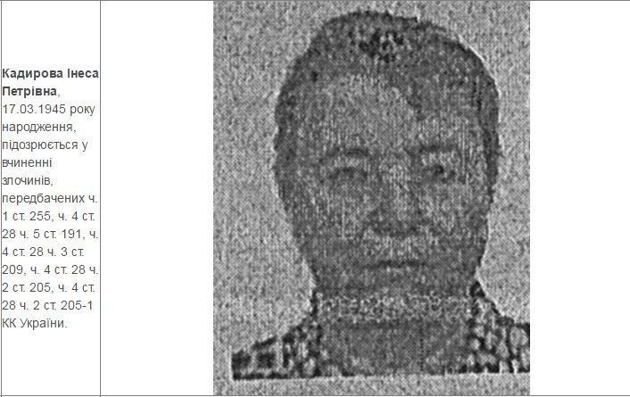 Инессу Кадырову подозревают в ряде преступлений, предусмотренных УК Украины.