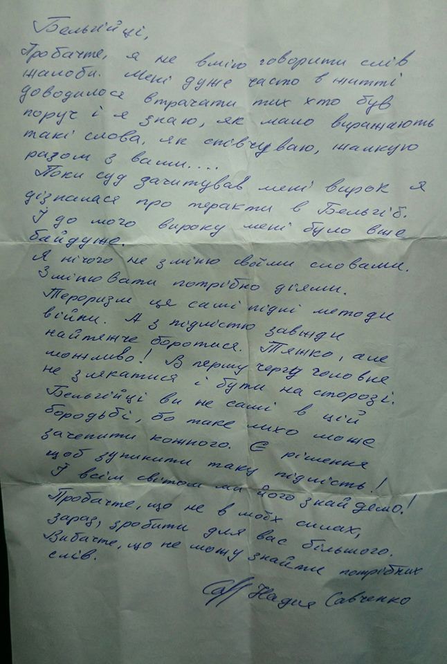 "Бельгийцы, простите, я не умею говорить слов скорби. Мне очень часто в жизни приходилось терять тех, кто был рядом, и я знаю, как мало выражают такие слова, как "сочувствую", "сожалею вместе с вами"... Пока суд зачитывал мне приговор, я узнала о терактах в Бельгии. И мой приговор мне был уже безразличен", - рассказала Савченко.