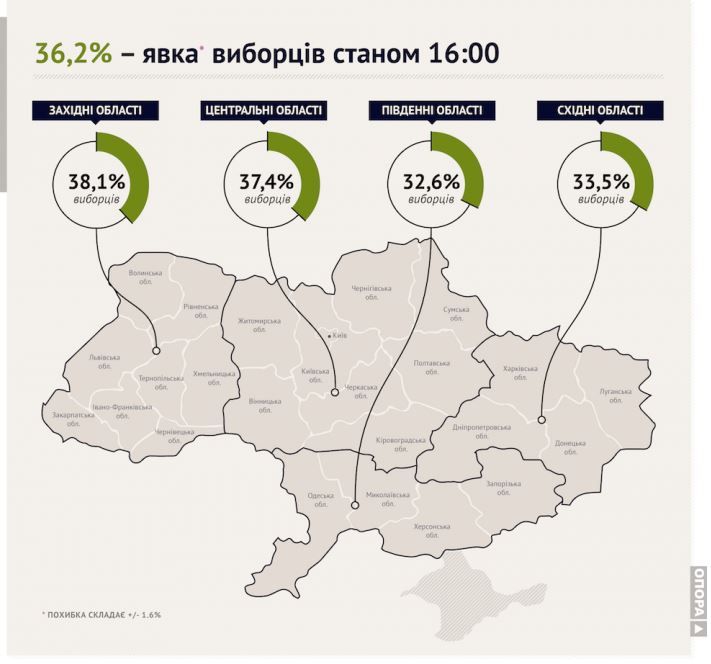 "ОПОРА" также проводит параллельный подсчет голосов: в Одессе проголосовало уже 29,6% избирателей, в Харькове 35,3% и в Днепропетровске 33,7%.