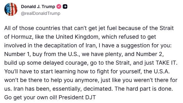 «Все те страны, которые не могут получить авиационное топливо через Ормузский пролив, например Великобритания, которая отказалась участвовать в "обезглавливании" Ирана, у меня есть для вас предложение: во-первых, покупайте у США — у нас этого достаточно, и во-вторых, наберитесь хотя бы отложенной смелости, отправляйтесь в пролив и просто заберите это», — говорится в заявлении американского президента.