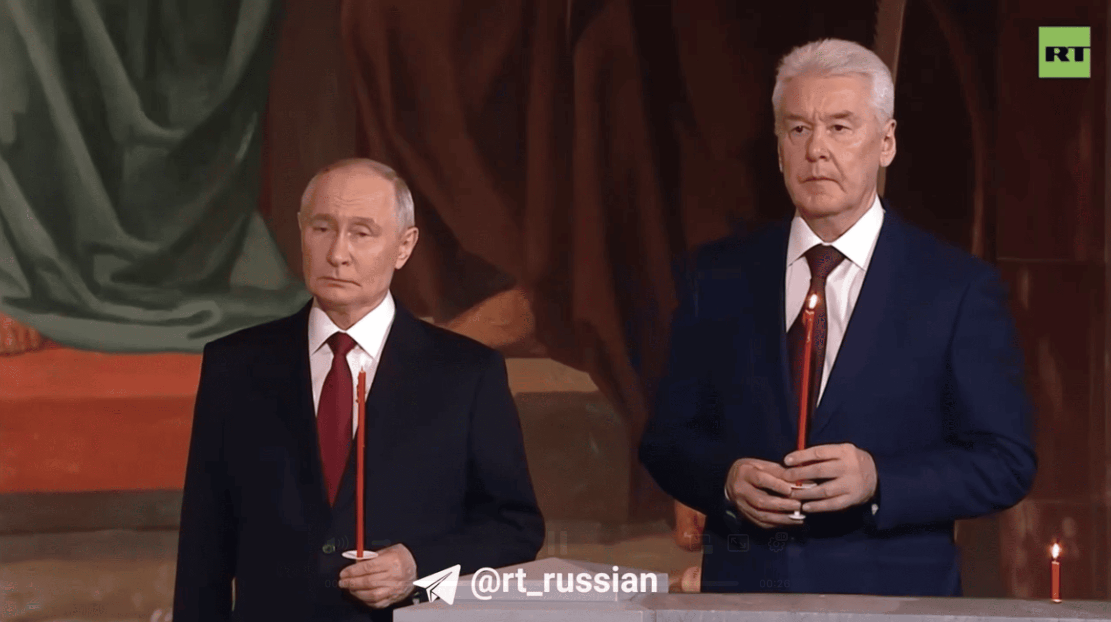 Российский диктатор Владимир Путин посетил пасхальное богослужение в Храме Христа Спасителя, где его провел глава РПЦ Патриарх Кирилл. Во время службы российский лидер держал зажженную свечу цвета крови и выступил с традиционным поздравлением.