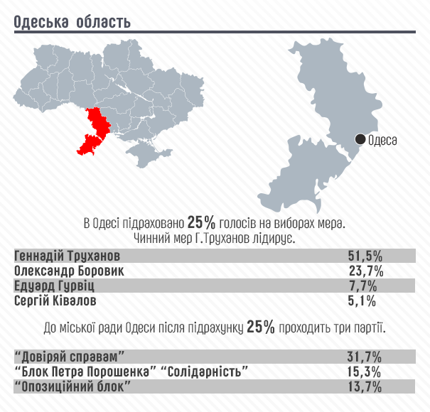 Кроме того, по результатам подсчета 25% бюллетеней, в Одесский городской совет проходят партии: "Доверяй делам" (31,7%), БПП "Солидарность" (15,3%), "Оппозиционный блок" (13,7%).