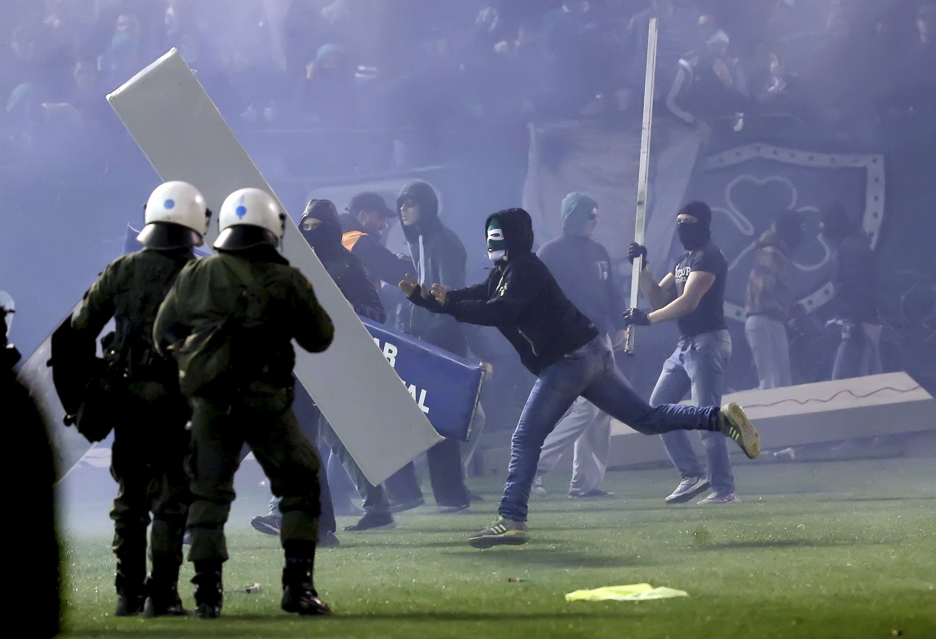 Во время разминки команд болельщики устроили настоящий "ад" на трибунах. Они поджигали файеры, бросали их на поле в футболистов, после чего начались потасовки с полицией.