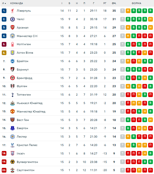 По итогам 15-го тура таблицу АПЛ возглавляет "Ливерпуль" (35 очков), который имеет матч в запасе. На втором месте находится "Челси" (31 балл). Третьим идет "Арсенал" (29 пунктов). Топ-4 замыкает "Манчестер Сити" (27 очков).
