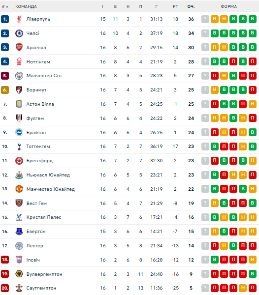По итогам 16-го тура таблицу АПЛ возглавляет "Ливерпуль" (36 очков), который имеет матч в запасе. На втором месте находится "Челси" (34 балла). Третьим идет "Арсенал" (30 пунктов). Топ-4 замыкает Ноттингем" (28 очков).