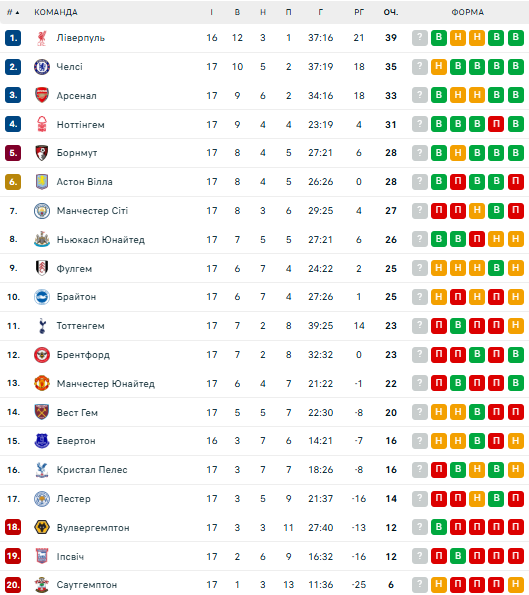 По итогам 17-го тура таблицу АПЛ возглавляет "Ливерпуль" (39 очков), который имеет матч в запасе. На втором месте находится "Челси" (35 баллов). Третьим идет "Арсенал" (33 пункта). Топ-4 сенсационно замыкает Ноттингем" (31 очко).