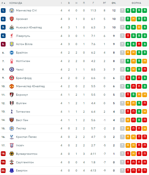 Таблица АПЛ после 4-го тура / © flashscore.ua