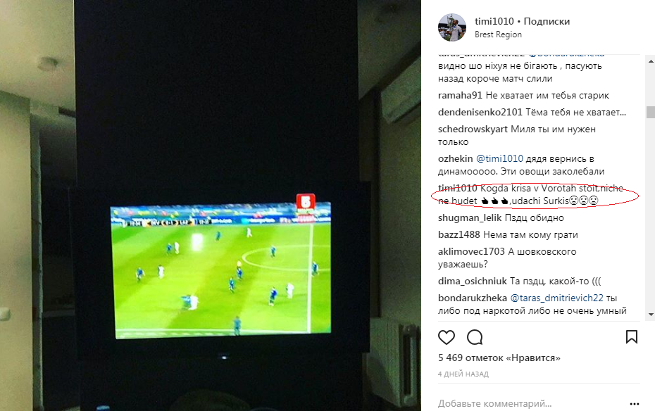 Милевский написал в Instagram "Когда в воротах стоит крыса - ничего не будет" под фото матча "Динамо" - "Лацио".