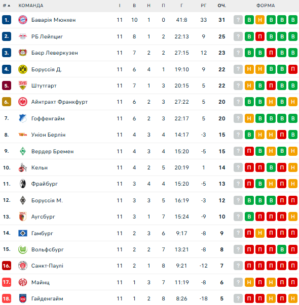 Таблица Бундеслиги после 11-го тура / © flashscore.ua