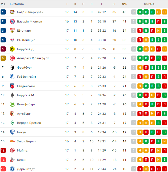 После 17-го тура таблицу Бундеслиги возглавляет "Байер" (45 очков). На втором месте – "Бавария" (41 балл + игра в запасе). Далее следуют "Штутгарт" (34) и "РБ Лейпциг" (33).