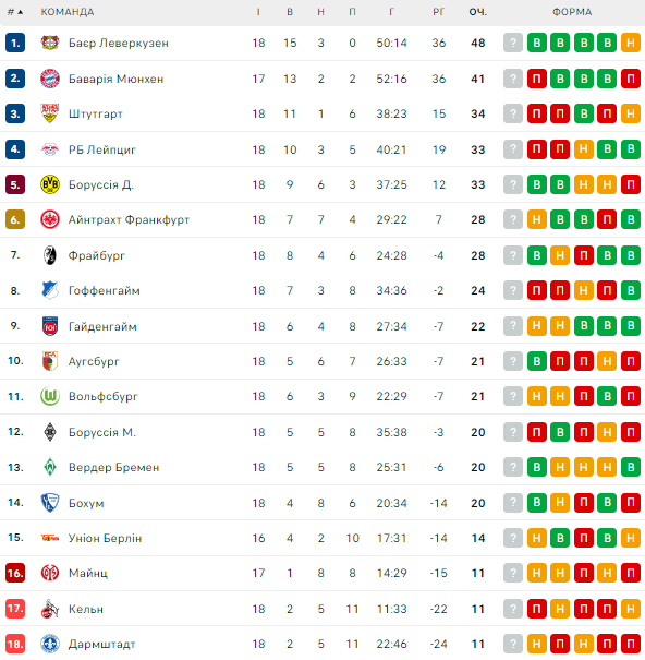 После 18-го тура таблицу Бундеслиги возглавляет "Байер" (48 очков). На втором месте – "Бавария" (41 балл + игра в запасе). Далее следуют "Штутгарт" (34), "РБ Лейпциг" (33) и "Боруссия" Дортмунд (33).