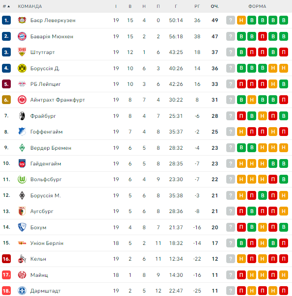 После 19-го тура таблицу Бундеслиги возглавляет "Байер" (49 очков). На втором месте – "Бавария" (47). Далее следуют "Штутгарт" (37) и "Боруссия" Дортмунд (36).