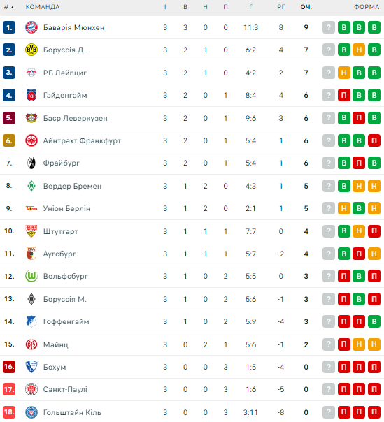 Таблица Бундеслиги после 3-го тура