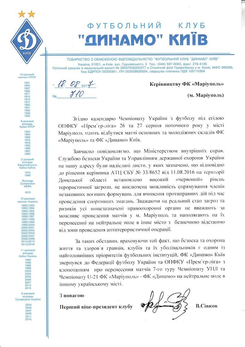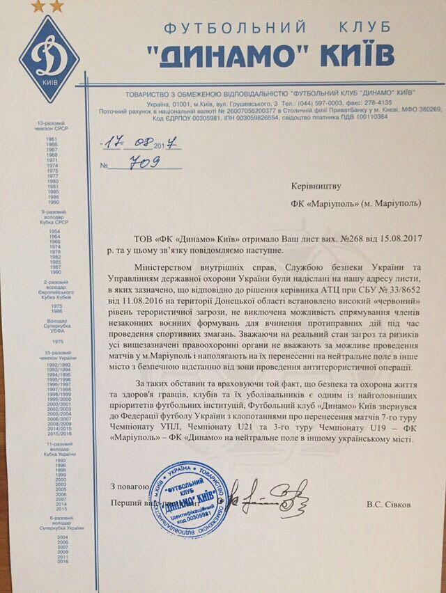 Вице-чемпион Украины приложил к своему заявлению на сайте письма, адресованные руководству мариупольской команды, в которых "Динамо" заранее проинформировало о невозможности при существующих условиях проводить матчи в Мариуполе.