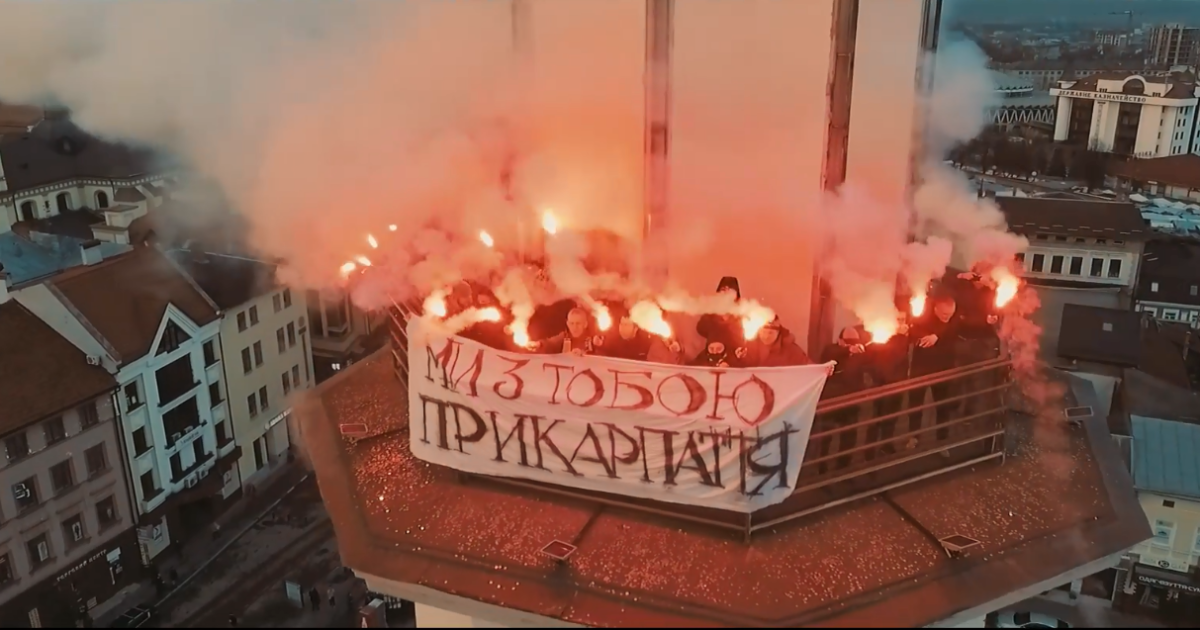 Футбольные фанаты зажгли файеры на городской ратуше Ивано-Франковска