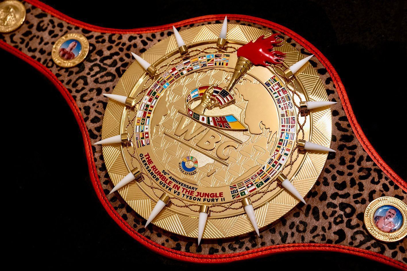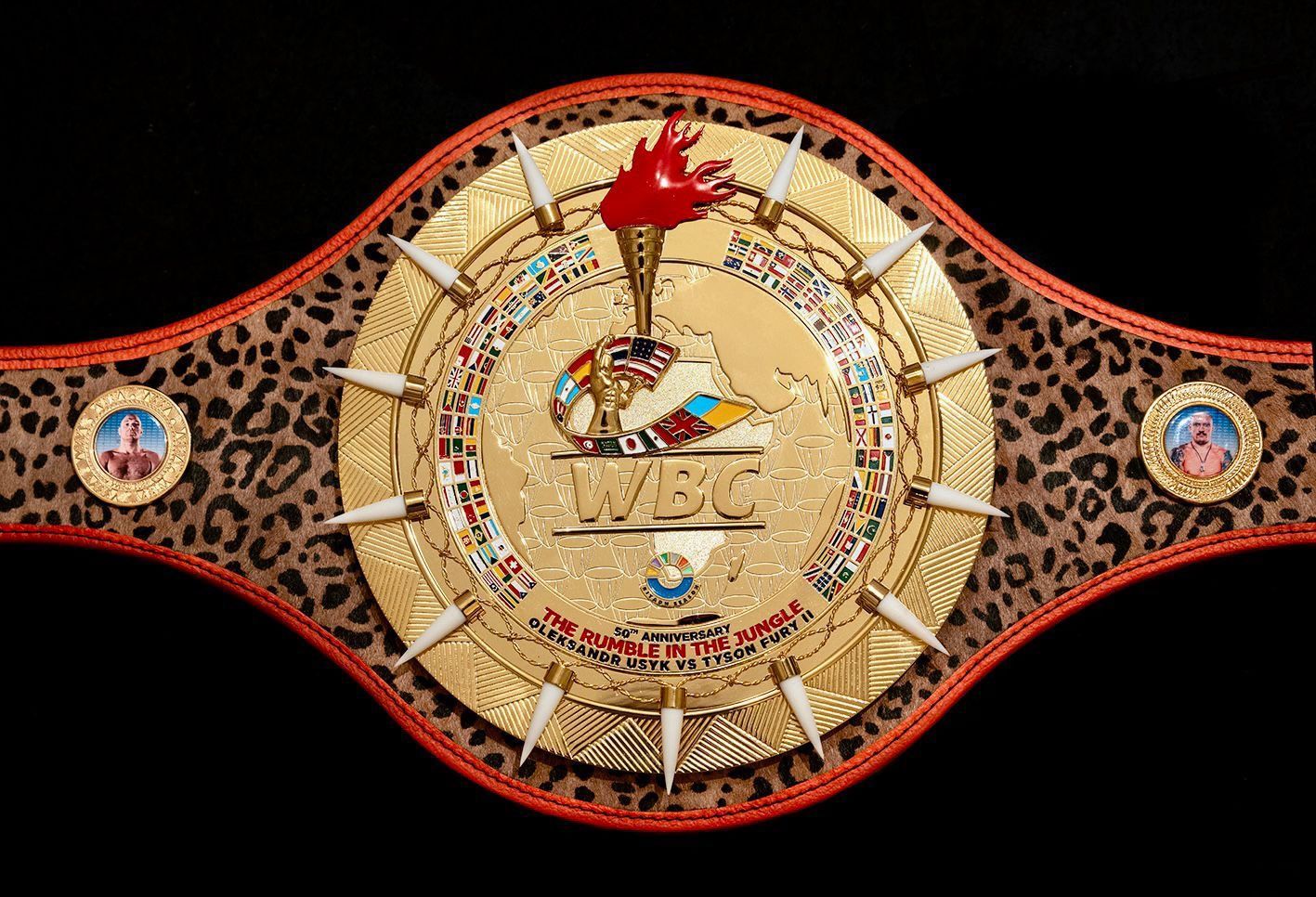 Пояс сделан из золота и украшен леопардовым принтом, а по его бокам расположены специальные пластины с изображениями украинского и британского боксеров. По словам Сулеймана, этот эксклюзивный трофей был "разработан и создан в сердце Африки".