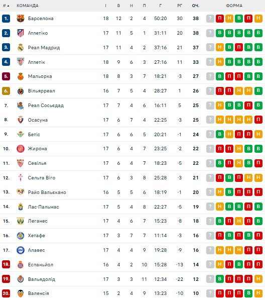 Таблица Ла Лиги после 17-го тура / © flashscore.ua