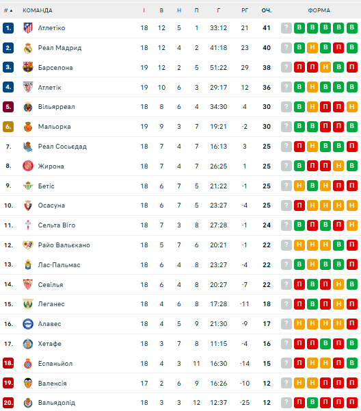 Таблица Ла Лиги после 18-го тура