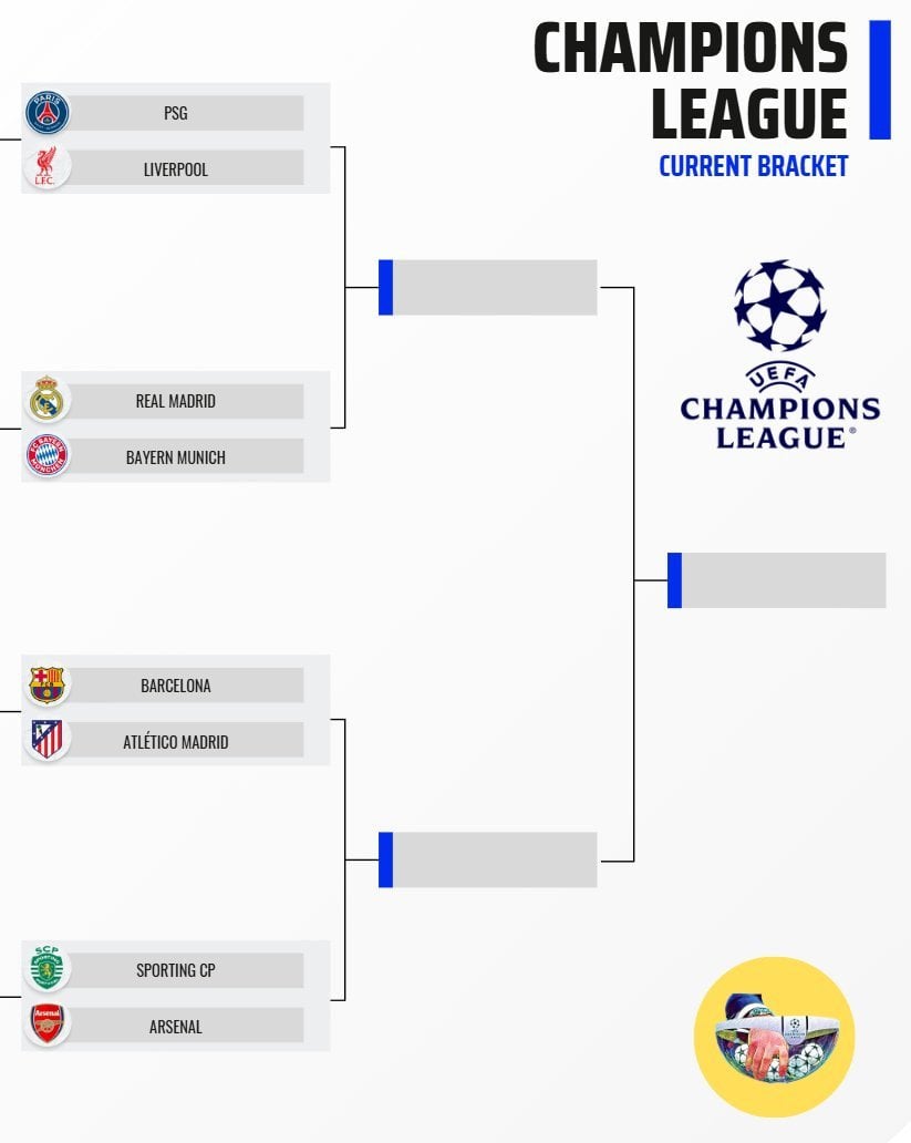 На этой стадии сыграют восемь клубов, которые смогли преодолеть 1/8 финала: "Спортинг", "Арсенал", ПСЖ, "Реал" Мадрид, "Барселона", "Бавария", "Ливерпуль" и "Атлетико".