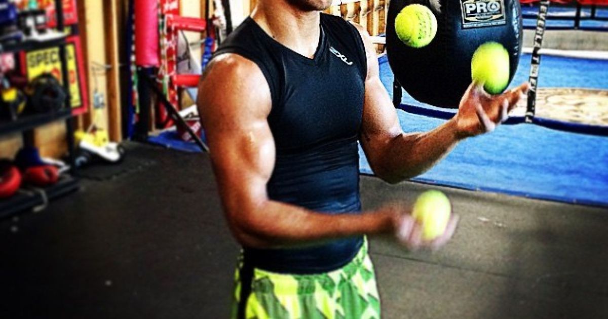 Василий не только проводит спарринги, он также жонглирует теннисными мячами и плавает.