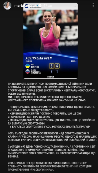 В связи с этим Костюк опубликовала сторис в своем Instagram, где выразила возмущение ситуацией и призвала спортивное сообщество прекратить работать площадкой для пропаганды "русского мира".