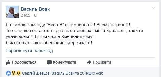 Президент винницкой "Нивы" Василий Вовк объявил о снятии клуба с чемпионата Второй лиги.