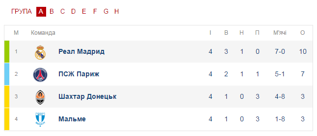 Турнирная таблица группы "Шахтера".