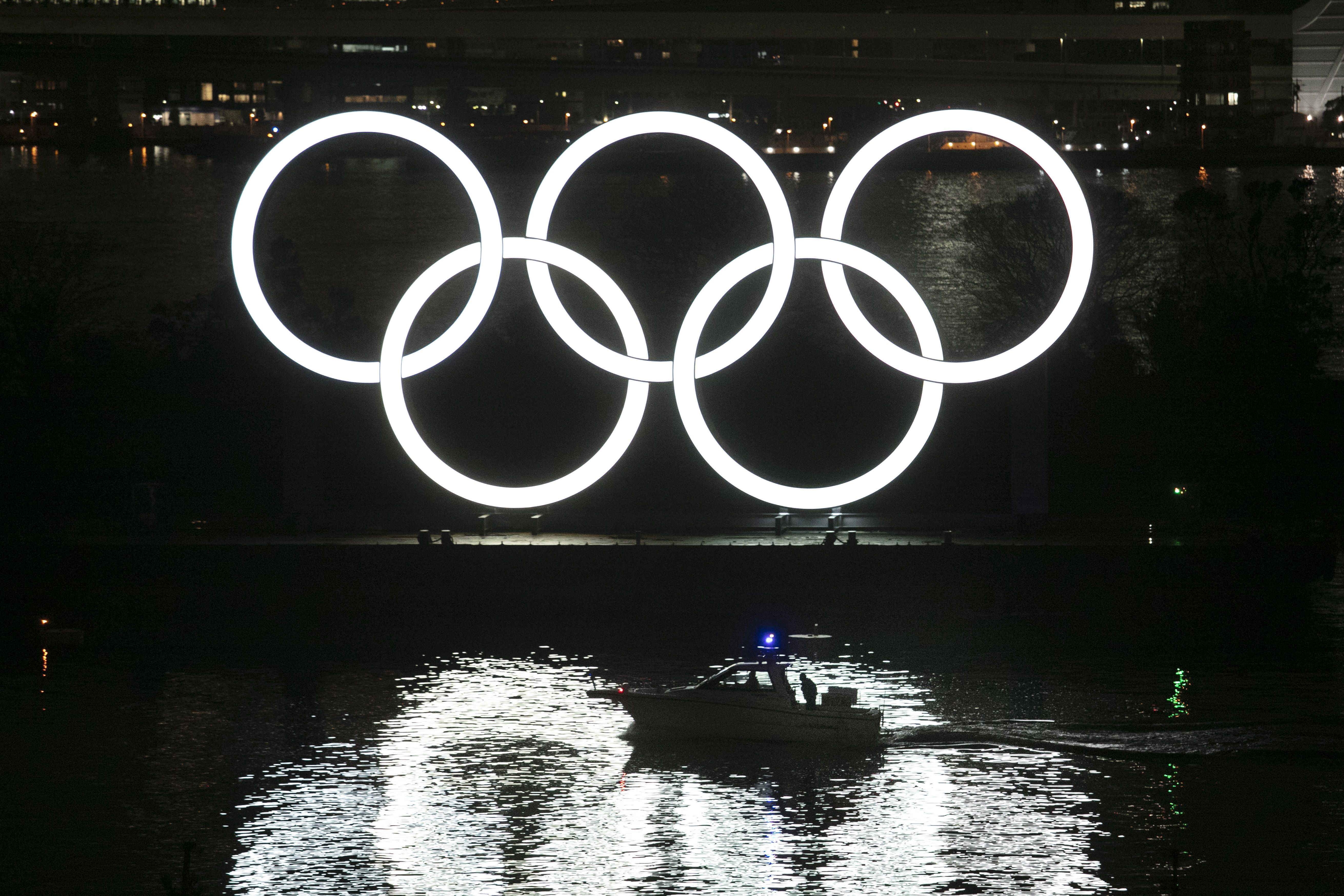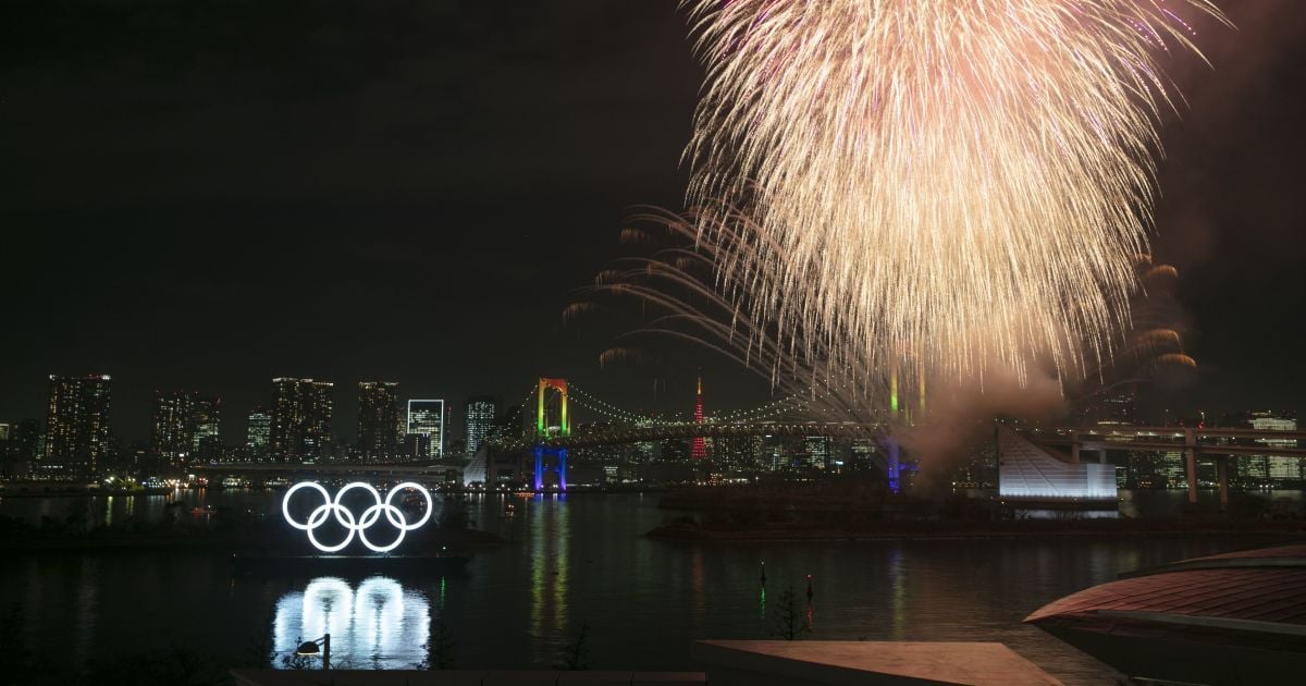 Фейерверк-шоу состоялось высоко над расположенным в Токийском заливе монументом в виде пяти олимпийских колец.