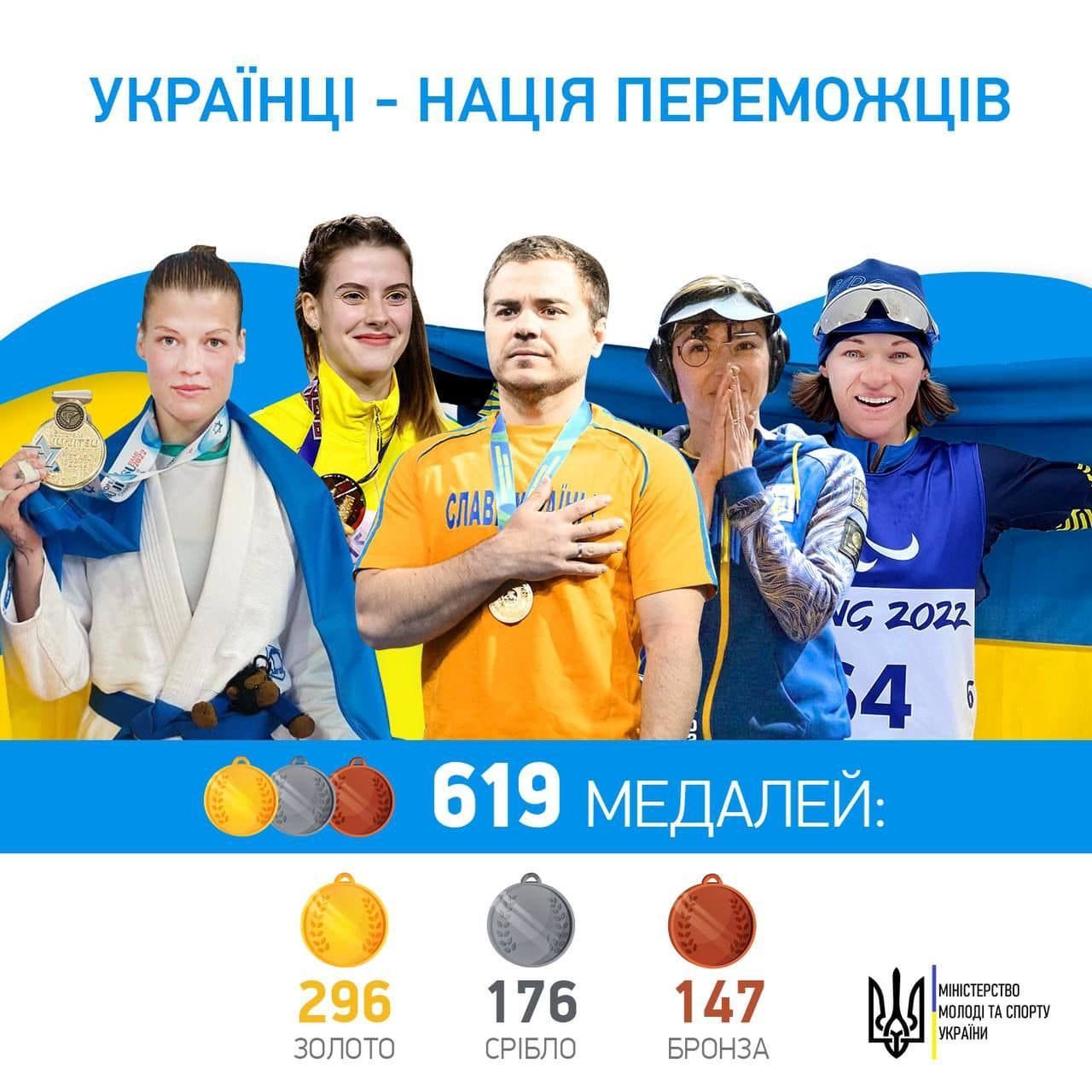С начала полномасштабного вторжения России в Украину украинские спортсмены и спортсменки завоевали на официальных международных соревнованиях по олимпийским, неолимпийским видам спорта и видам спорта лиц с инвалидностью - 619 наград: