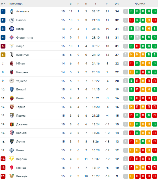 По итогам 15-го тура таблицу Серии А возглавила "Аталанта" (34 очка). Второе место занимает "Наполи" (32 балла). На третьей и четвертой позициях соответственно расположились "Интер" и "Фиорентина" (по 31 пункту), которые имеют матч в запасе.