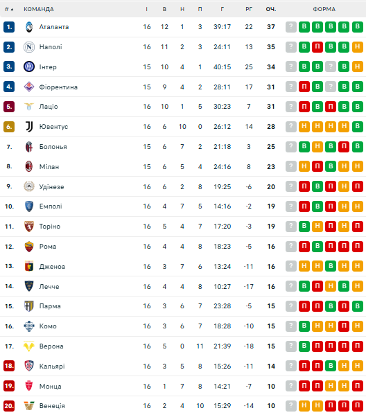 После 16-го тура таблицу Серии А возглавляет "Аталанта" (37 очков). Второе место занимает "Наполи" (35 баллов). На третьей строчке располагается "Интер" (34 пункта), который имеет матч в запасе.