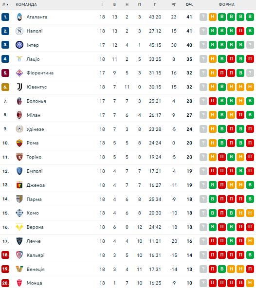 После 18-го тура таблицу Серии А возглавляют "Аталанта" и "Наполи" (по 41 очку). Третье место занимает "Интер" (40 баллов), который имеет матч в запасе.