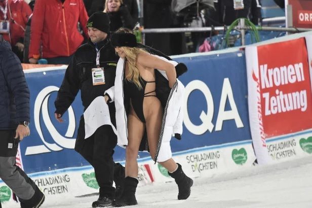 23-летняя красотка в откровенном купальнике прорвалась на финиш трассы во время этапа Кубка мира по горным лыжам в Австрии.