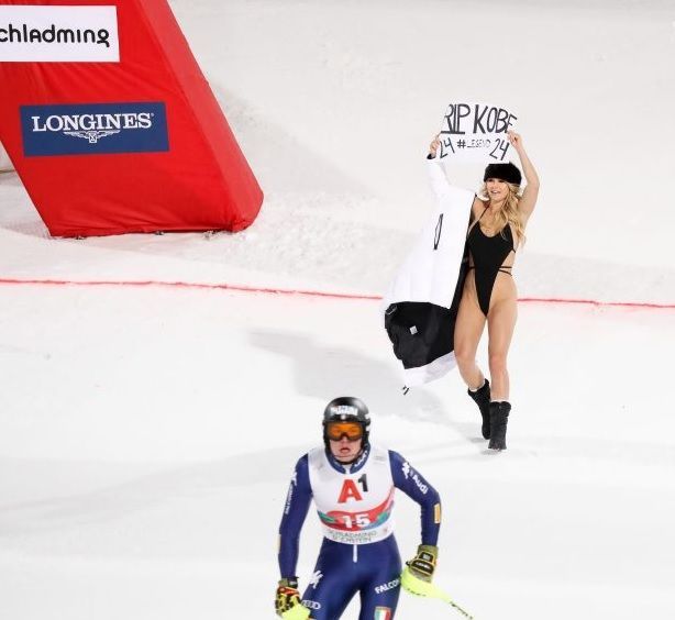 Скандальная блондинка с финала Лиги чемпионов в купальнике выбежала на горнолыжную трассу с плакатом о Коби Брайанте