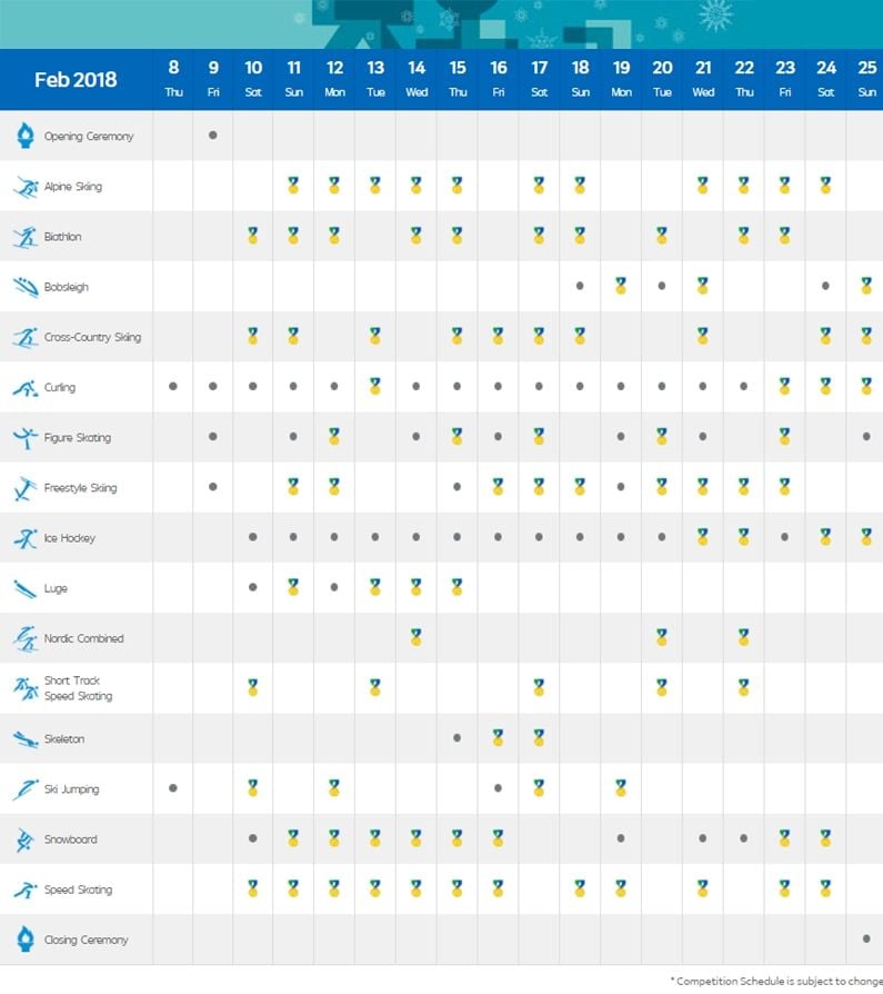 Оргкомитет зимних Олимпийский игр 2018 года, которые состоятся в корейском Пхенчхане, объявил расписание соревнований.