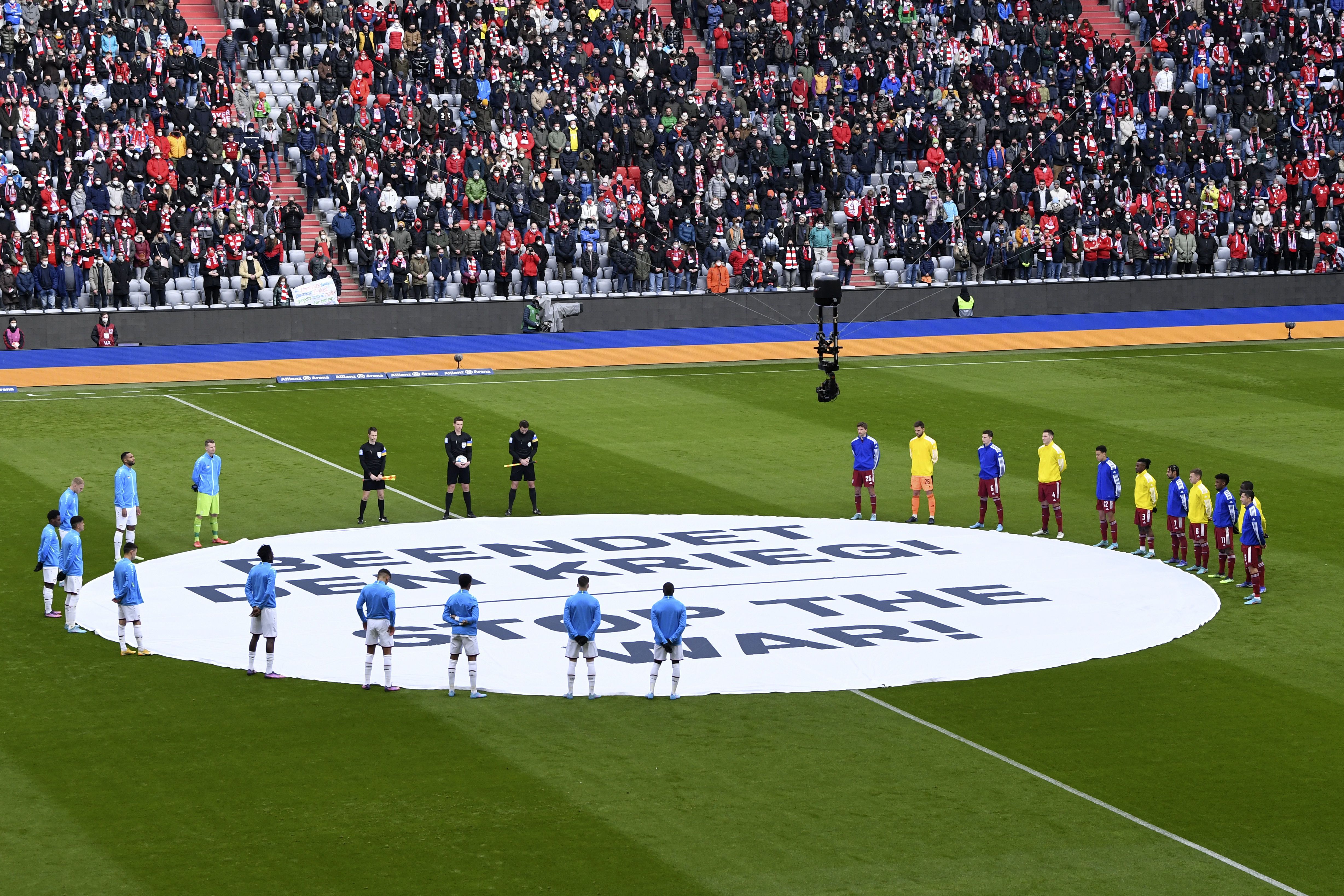 Перед началом матча в центральном круге стадиона "Альянц Арена" был развернут баннер с надписью "Стоп войне", а игроки обеих команд вышли на поле в синих и желтых куртках.
