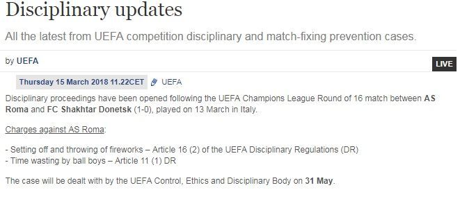 Европейский футбольный союз (УЕФА) открыл дисциплинарное дело в отношении ответного матча 1/8 финала Лиги чемпионов "Рома" – "Шахтер".